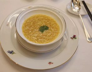 相对于婆参的浓汁厚味,清汤螺片则是另一番滋味。这道菜很是考验厨师的刀工,螺片被切得极薄如纸,几乎呈现半透明状态。用老鸡、排骨熬制而成的汤底清而不淡,螺片放入其中稍微汆烫即可,盛盘后依然爽脆嫩滑,座底的青瓜也充分吸收了汤底的味道,显得甘甜鲜美。